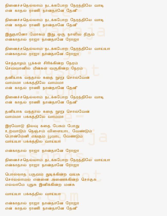 Lyrics of the Song: Ninaichchathellaam நினைச்சதெல்லாம் நடக்கபோற நேரத்திலே வாடி