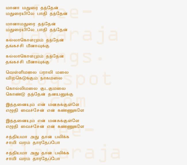 Lyrics of the Song : Maanaa Mathurai மானா மதுரை தந்தேன் மதுரையிலே பாதி தந்தேன்