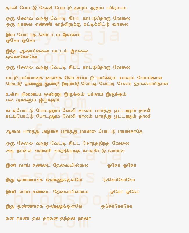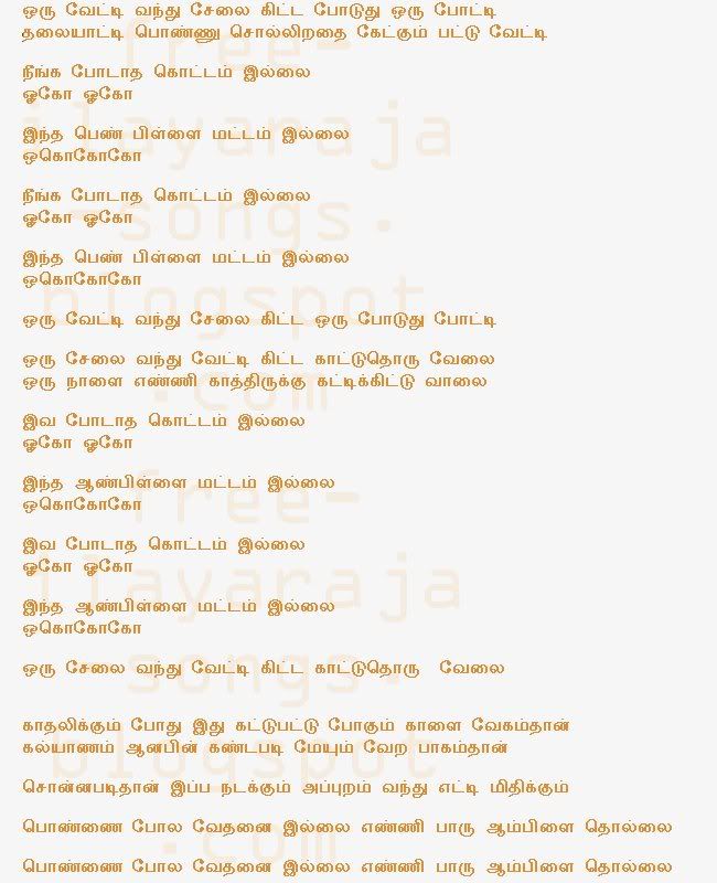 Lyrics of the Song : Oru Vetti ஒரு வேட்டி வந்து சேலை கிட்ட போடுது ஒரு போட்டி