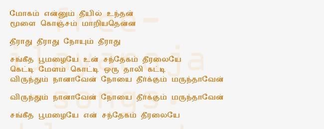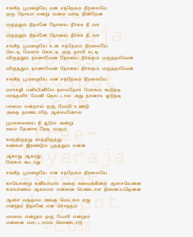 Lyrics of the Song: Sangeetha Poomazhaiye சங்கீத பூமழையே என் சந்தேகம் தீரலையே